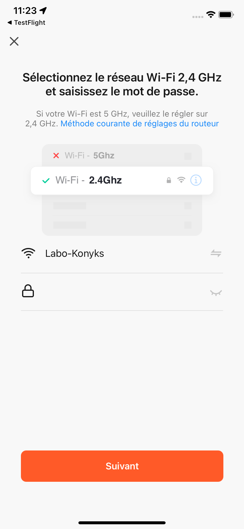 - Sélectionnez le réseau Wifi 2.4 Ghz et saisissez le mot de passe Wifi :